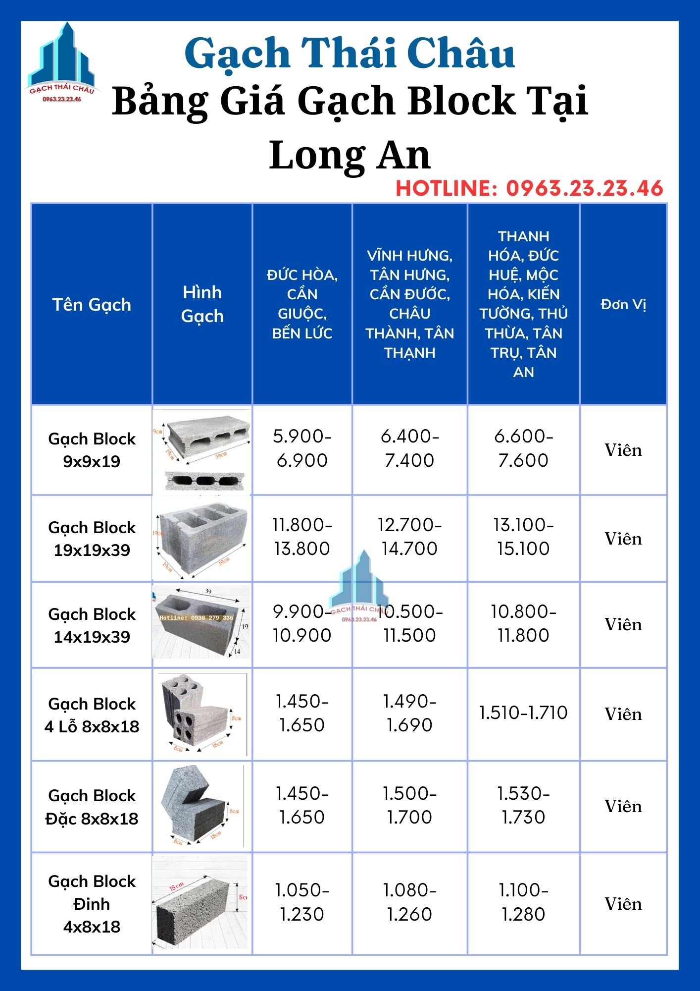 => Giá gạch block tại Long An cực kỳ tốt với các công trình lớn, đặc biệt giá vận chuyển vô cùng hạt dẻ dành cho các công trình, dự án nằm ở đường lớn, không bị cấm tải, cấm giờ. Giá gạch block 9x19x39 tại Long An chỉ khoảng 5.900-7.600/viên, giá gạch block 14x19x39 là 9.900-11.800/viên, giá gạch block 19x19x39 chỉ nằm trong 11.800-15.100/viên, giá gạch block 4 lỗ 8x8x18 là 1.450-1.710/viên, giá gạch block đặc 8x8x18 trong tầm 1.450-1.730/viên và giá gạch block đinh 4x8x18 là 1.050-1.280/viên. Để biết thêm thông tin chi tiết về giá gạch block tại Long An, mời quý khách hàng tham khảo tại bảng sau đây: