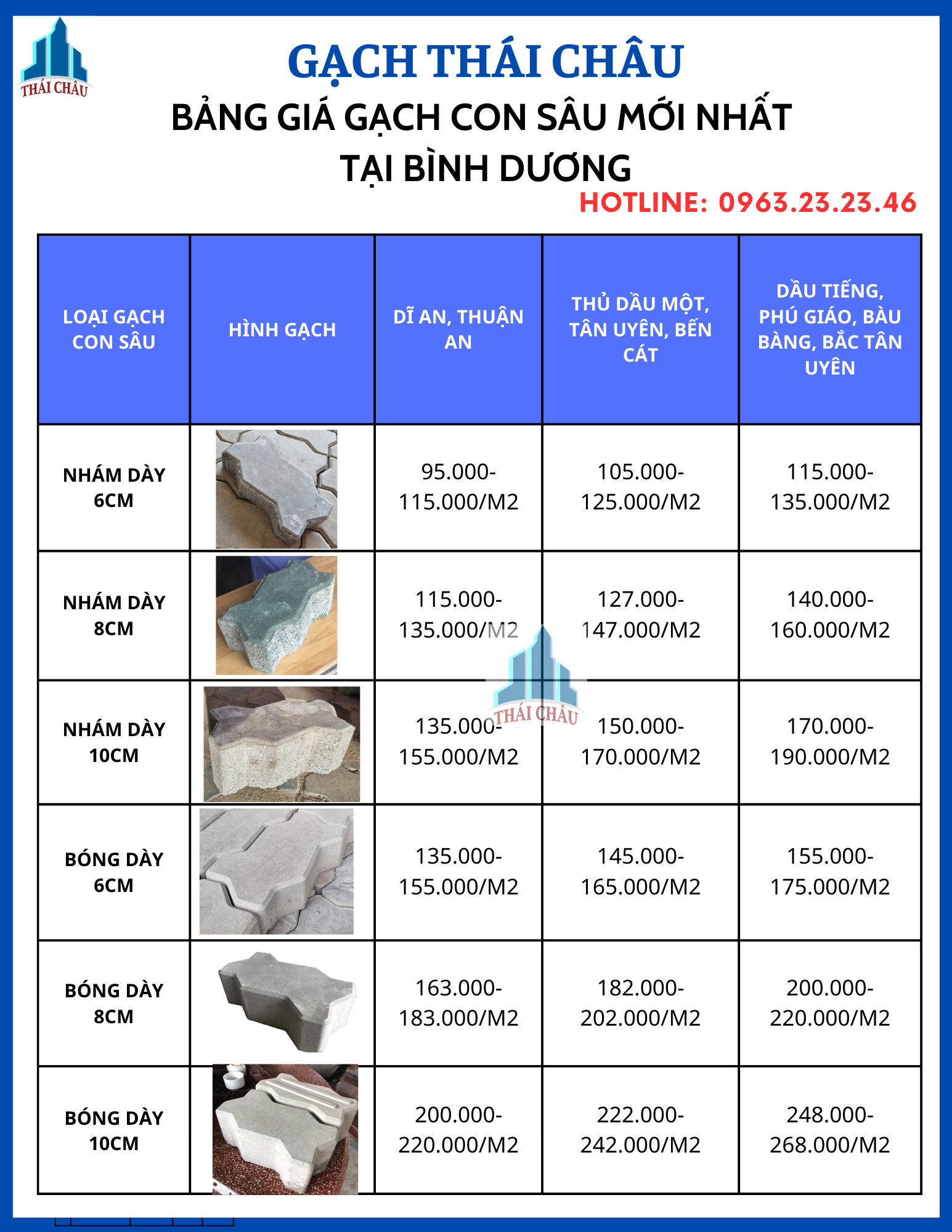 Đối với tỉnh Bình Dương, giá gạch con sâu lát vỉa hè dao động từ 95-268.000/m2. Đặc biệt, gạch con sâu sẽ có giá tốt nhất khi giao tại các khu vực tại Dĩ An, Thuận An do khoảng cách gần, hệ thống giao thông phát triển. Giá gạch con sâu giao tại đây chỉ khoảng từ 95.000 đến 220.000/m2. Cụ thể, gạch con sâu dày 6cm khi giao tới Dĩ An sẽ có giá khoảng từ 95-115.000/m2. Với các khu vực tại trung tâm như Thủ Dầu Một, Tân Uyên, Bến Cát thì giá gạch con sâu sẽ nhỉnh hơn một chút, chỉ khoảng từ 105.000 đến 242.000/m2. Giá gạch con sâu tại Bắc Tân Uyên, Phú Giáo, Dầu Tiếng, Bàu Bàng sẽ nhỉnh hơn so với các khu vực còn lại vì đây là những huyện nằm hơi xa trung tâm, tại đây có khoảng cách giữa các huyện tương đối lớn nên có biên độ giá rộng. Tuy nhiên, nhờ mật độ dân cư thưa giúp cho quá trình vận chuyển gạch nhanh và đơn giản hơn nên giá gạch tại khu vực này nhìn chung vẫn rất tốt. Nhìn chung, giá gạch con sâu khi giao tại Bình Dương tương đối tốt do đây là tỉnh có kinh tế phát triển, nhiều khu công nghiệp lớn nên nhu cầu sử dụng gạch lớn, giá gạch vô cùng cạnh tranh. Để biết thêm thông tin chi tiết về giá gạch con sâu giao tới các huyện của Bình Dương, mời quý khách hàng xem tại bảng dưới đây: