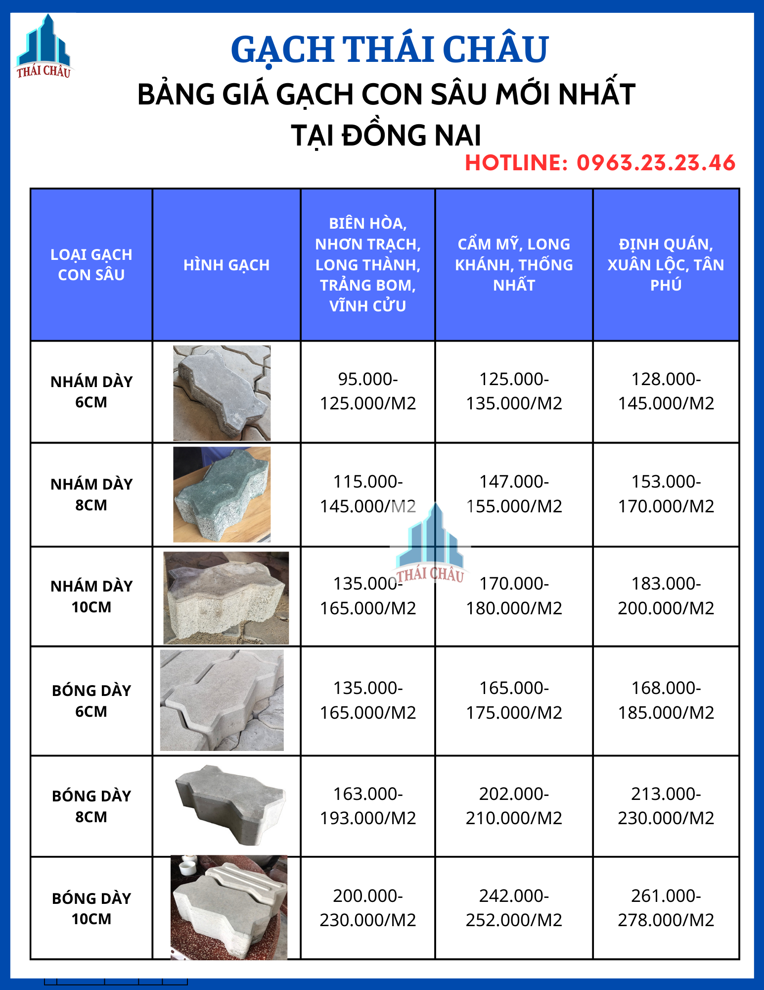 Tại Đồng Nai, giá gạch con sâu khá tốt, chỉ từ 95-278.000/m2. Giá gạch sẽ tốt nhất đối với các huyện giáp Tp Hồ Chí Minh như Biên Hoà, Nhơn Trạch, Long Thành, Trảng Bom, Vĩnh Cửu do khoảng cách gần, hệ thống giao thông thuận lợi. Giá gạch con sâu khi giao tới các khu vực này rơi vào khoảng từ 95.000 đến 230.000/m2. Đặc biệt là các công trình ở Vĩnh Cửu sẽ có giá gạch tốt nhất do có địa chỉ nhà máy đặt tại đây, giá gạch con sâu ở đây chỉ nằm trong khoảng 95-209.000/m2. Cụ thể, gạch con sâu dày 6cm khi giao tại công trình Vĩnh Cửu sẽ có giá khoảng 95-125.000/m2. Đối với các công trình nằm ở các huyện Cẩm Mỹ, Long Khánh, Thống Nhất do nằm ở vị trí trung tâm nên gạch con sâu giao tại đây tương đối tốt nhờ hệ thống giao thông thuận lợi, có các trục đường quốc lộ lớn, thời gian giao hàng nhanh chóng nên giá gạch chỉ trong khoảng từ 125.000 đến 252.000/m2. Chi tiết về giá của gạch con sâu giao tại các huyện của Đồng Nai được thể hiện ở bảng dưới đây: