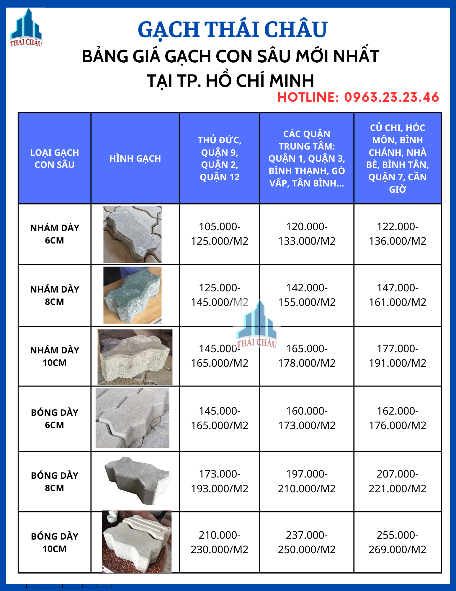 Trong bài viết này, chúng ta sẽ tìm hiểu về báo giá gạch con sâu lát vỉa hè mới nhất, các bảng giá chi tiết khi giao gạch con sâu về tỉnh TP. Hồ Chí Minh, Bình Dương, Đồng Nai và Long An, từ đó giúp bạn có cái nhìn tổng quan về mức giá để dễ dàng ra quyết định mua hàng hơn.