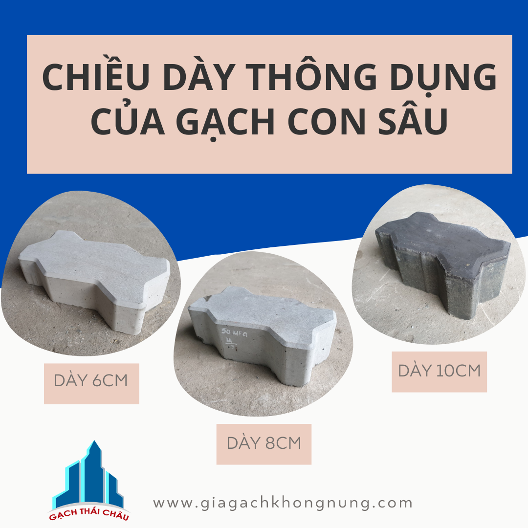 Chiều dày gạch càng cao thì khả năng chịu kéo, uốn và kháng momen xoắn Trên thị trường hiện nay thường có 3 loại chiều dày chính của gạch con sâu là dày 6cm, dày 8cm và dày 10cm. của gạch càng lớn. Vậy ta cần tăng chiều dày gạch với các trường hợp nền đất yếu hay sụt lún hoặc khu vực thường xuyên ẩm ướt. Chiều dày của gạch con sâu tỉ lệ thuận với giá gạch, tức là chiều dày càng cao thì giá gạch càng tăng.