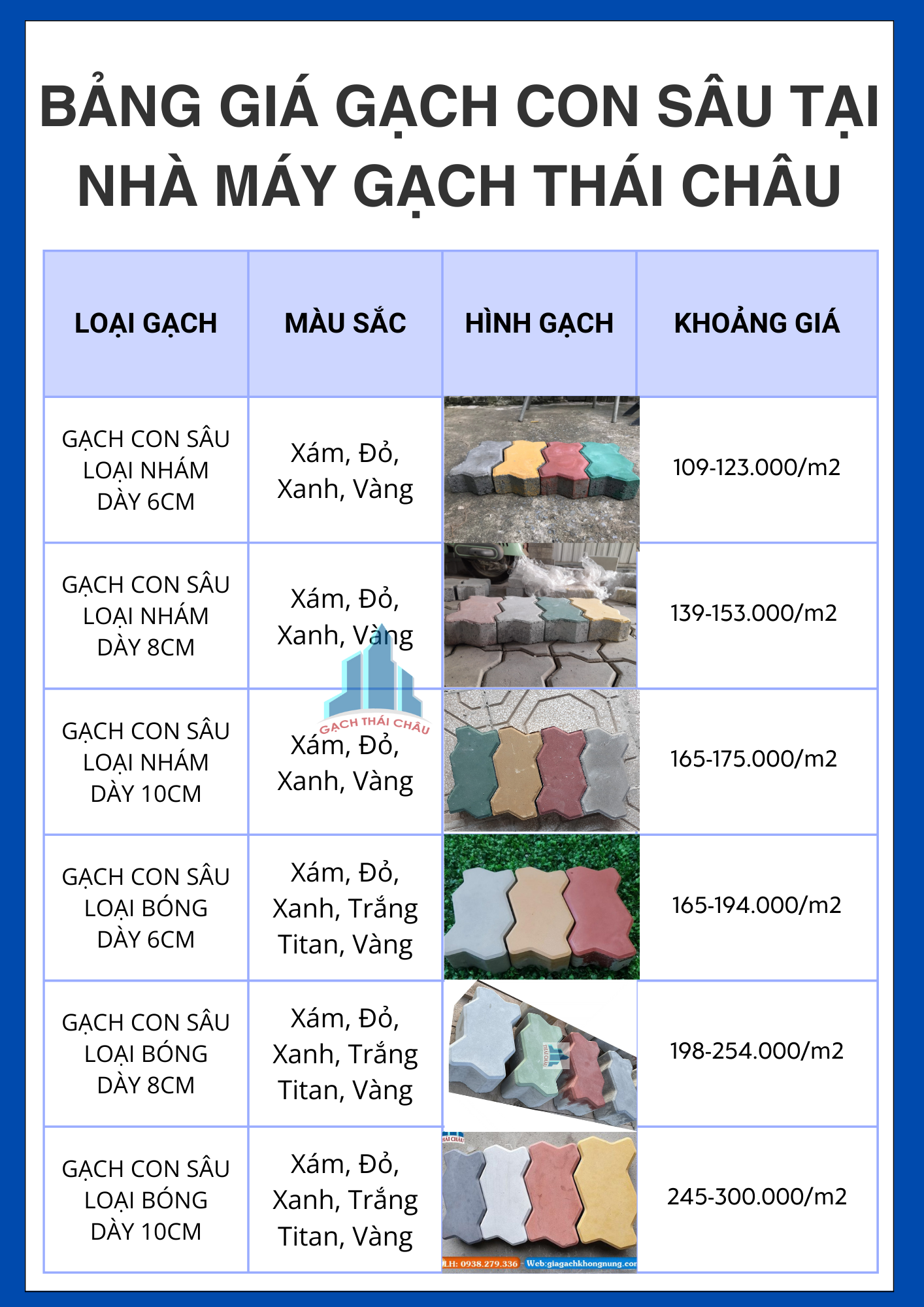 => Trên đây là giá cơ bản của gạch con sâu lát vỉa hè tại nhà máy, thực tế giá gạch con sâu còn phụ thuộc vào nhiều yếu tố như số lượng, màu sắc, mac gạch, loại gạch. Để nắm được rõ hơn giá gạch con sâu giao đến tận công trình của mình, hãy liên hệ với NV tư vấn Hotline: 0963 2323 46 hoặc quý khách để lại thông tin Email, số điện thoại của mình qua cửa sổ chát offline ở cuối màn hình của trang Web. Nhân viên tư vấn bán hàng của Gạch Block Thái Châu sẽ liên lạc lại và tư vấn báo giá gạch nhanh và chính xác nhất.
