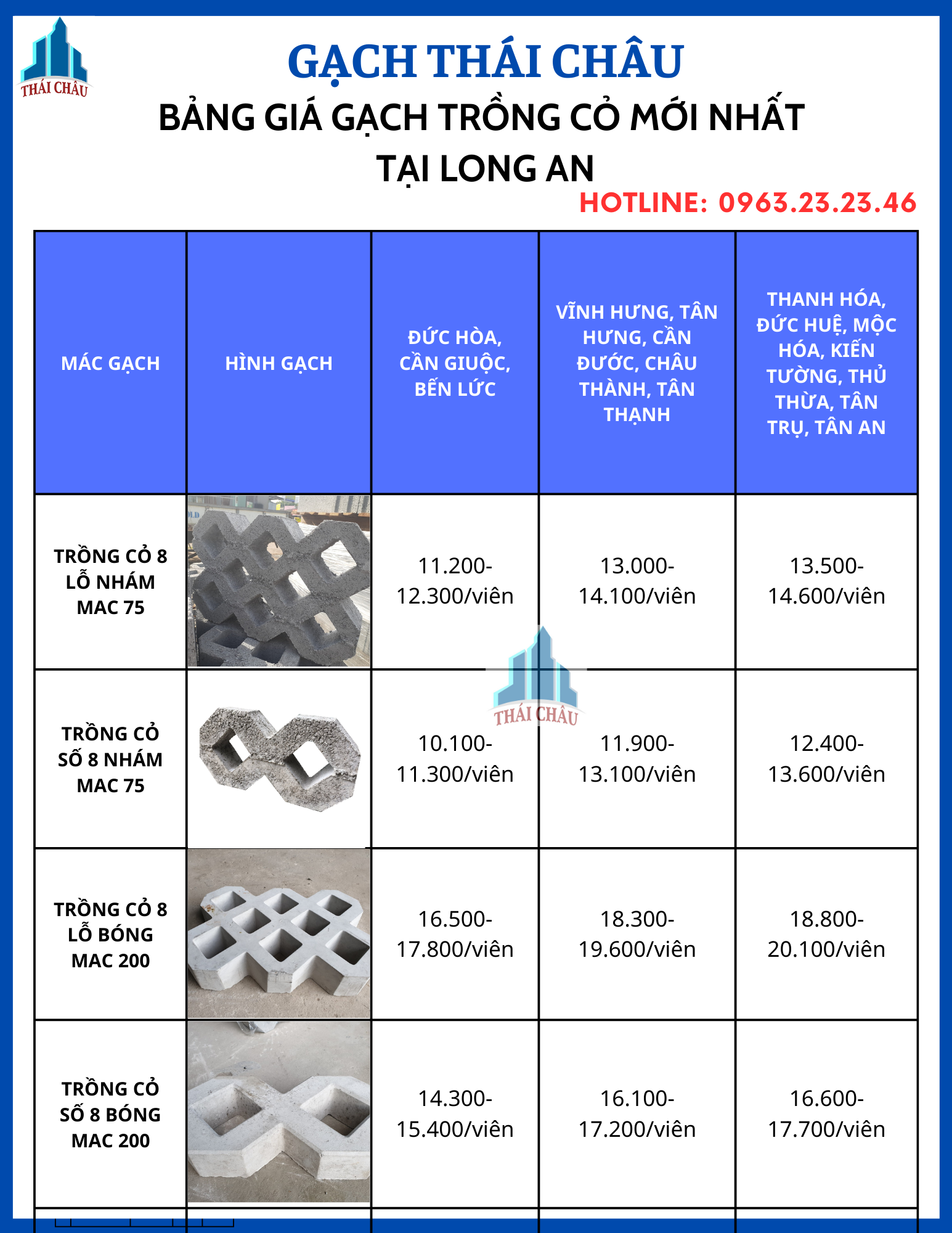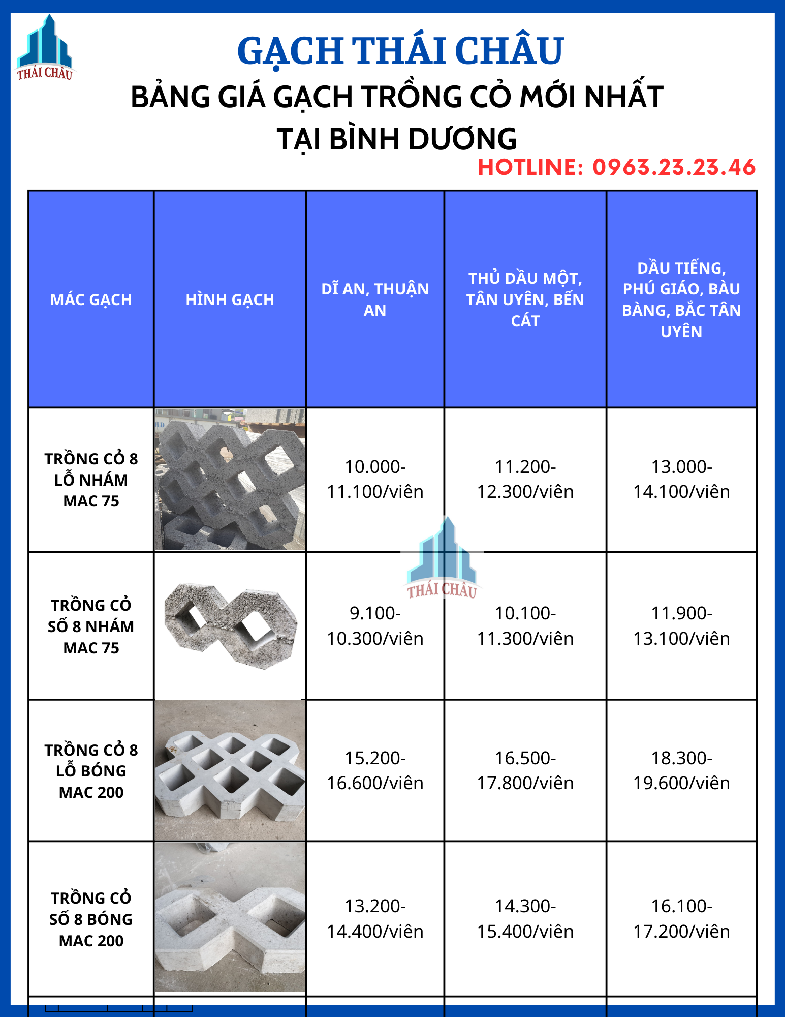 Trên đây là các thông tin cơ bản để tham khảo giá gạch trồng cỏ tại Tp. Hồ Chí Minh, Bình Dương, Đồng Nai, Long An. Để biết giá chi tiết của các sản phẩm gạch trồng cỏ giao tới công trình của mình, hãy liên hệ ngay với Thái Châu để nhận được báo giá gạch trồng cỏ tốt nhất. Gạch Thái Châu đã và đang là đơn vị cung cấp gạch có uy tín hàng đầu tại khu vực Miền Nam. Công ty chuyên cung cấp giá đấu thầu, dự toán cho các dự án lớn, trọng điểm. Vì có nhà máy sản xuất nên giá thành sản phẩm luôn thấp nhất, sát giá nhất cho khách hàng sử dụng. Nếu có thắc mắc về giá gạch trồng cỏ, chất lượng sản phẩm, tiến độ đặt hàng và giao hàng. Xin quý khách liên hệ với NV tư vấn Hotline: 0963 2323 46 hoặc quý khách để lại thông tin Email, số điện thoại của mình qua cửa sổ chát offline ở cuối màn hình của trang Web. Nhân viên tư vấn bán hàng của Gạch Block Thái Châu sẽ liên lạc lại và tư vấn mọi yêu cầu của quý khách.