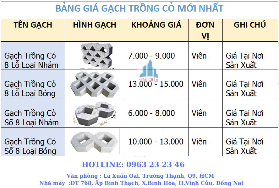 Gạch Thái Châu xin giải đáp thắc mắc của khách hàng là gạch lát vỉa hè giá bao nhiêu theo loại gạch. Như đã giới thiệu ở phần trước thì gạch lát vỉa hè có 3 loại chính là gạch lát vỉa hè terrazzo, gạch lát vỉa hè trồng cỏ và gạch lát vỉa hè tự chèn. Sau đây là bảng giá gạch lát vỉa hè được cập nhật bởi Công ty Sản Xuất Gạch Thái Châu: