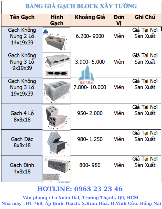 Dưới đây là bảng giá gạch block xây tường tại xưởng mới nhất được cập nhật từ công ty Gạch Thái Châu: