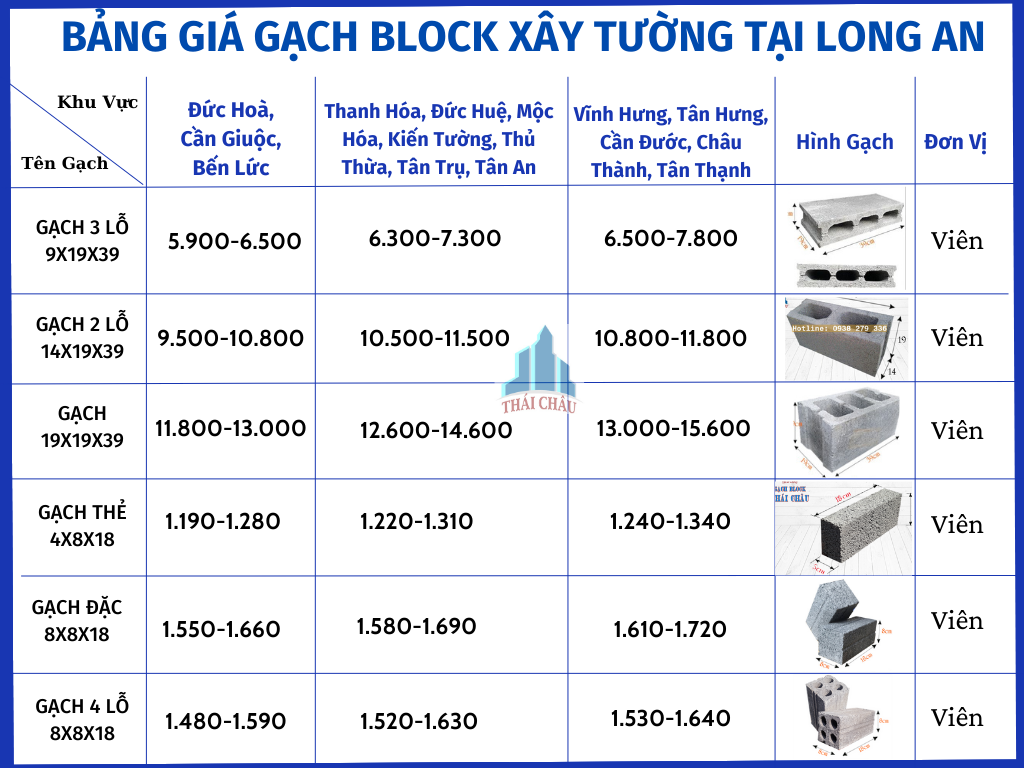 Tiếp theo là chi tiết giá gạch block tại Long An khi giao tới tận công trình và cẩu xuống hàng được cập nhật tại Công ty Sản xuất Gạch Thái Châu. Tại khu vực Long An, vì đây là khu vực có nền kinh tế đang phát triển nên hạ tầng giao thông ở đây rất tốt. Đặc biệt, các khu vực giáp với Tp Hồ Chí Minh như Đức Hoà, Cần Giuộc có hệ thống giao thông như QL 1A, Đường Nguyễn Văn Linh, Vành Đai 4 nối Đồng Nai- Bình Dương- TP. Hồ Chí Minh- Long An, Đường Võ Văn Kiệt kết nối với các quận lớn của Tp Hồ Chí Minh, Bình Dương, Đồng Nai rất phát triển. Ngoài ra, đây là tỉnh có nhiều tiềm năng vì đang triển khai nhiều dự án xây dựng khu công nghiệp, nhu cầu đang rất sôi động, nhiều khu vực có nhu cầu lớn về các loại gạch Block xây tường như các khu công nghiệp lớn, các khu nhà phố,... Giá gạch Block xây tường giao tới Long An tương đối tốt, ví dụ giá gạch block 9x19x39 giao tới Long An nằm trong khoảng từ 5.900-6.800/viên, gạch thẻ 4x8x18 khoảng 1.990-1.280/viên, gạch 4 lỗ khoảng 1.480-1.590/viên. Cụ thể giá gạch Block xây tường giao tại các huyện thuộc Long An là: