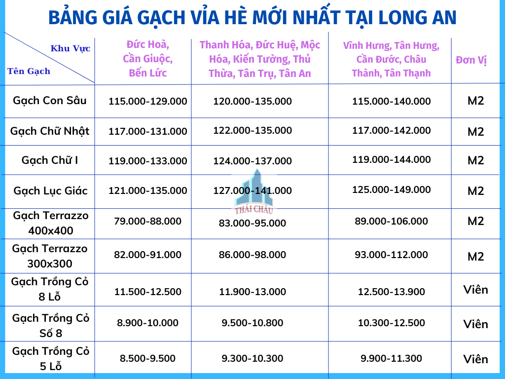 Là trung tâm phát triển kinh tế năng động, hiệu quả, bền vững của khu vực phía Nam, Long An đã và đang trở thành cửa ngõ trên tuyến hành lang kinh tế đô thị - công nghiệp của vùng Đồng bằng Sông Cửu Long; kết nối chặt chẽ với TP Hồ Chí Minh và các tỉnh miền Đông Nam bộ. Với động lực phát triển kinh tế như vậy, Long An hiện đã và đang triển khai rất nhiều dự án khu công nghiệp lớn như Khu công nghiệp Cầu cảng Phước Đông, Khu công nghiệp Cầu Tràm, Khu công nghiệp Tân Kim, Khu công nghiệp Long Hậu, Khu công nghiệp Đức Hoà,…Theo sự phát triển kinh tế đó, nhu cầu sử dụng gạch tại tỉnh Long An cho các công trình xây dựng vô cùng sôi động, đặc biệt là các loại gạch vỉa hè. Vì Long An là nơi thường xuyên chịu ảnh hưởng bởi mưa gió, bão lũ,… nên gạch vỉa hè được ưa chuộng vô cùng tại nơi đây nhờ đặc tính thấm nước tốt, thoát nước nhanh, không bị ứ đọng lâu. Trong bài viết này, chúng ta sẽ tìm hiểu rõ bảng giá gạch vỉa hè mới nhất hiện nay được cập nhật tại nhà máy sản xuất Gạch Thái Châu và chi phí vận chuyển, giao hàng tới các huyện tại Long An của các loại gạch vỉa hè đang được sử dụng phổ biến.