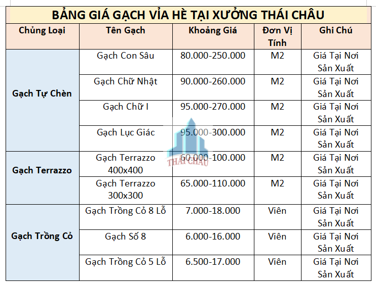 Dưới đây là bảng giá gạch vỉa hè tại xưởng mới nhất được cập nhật từ công ty Gạch Thái Châu: