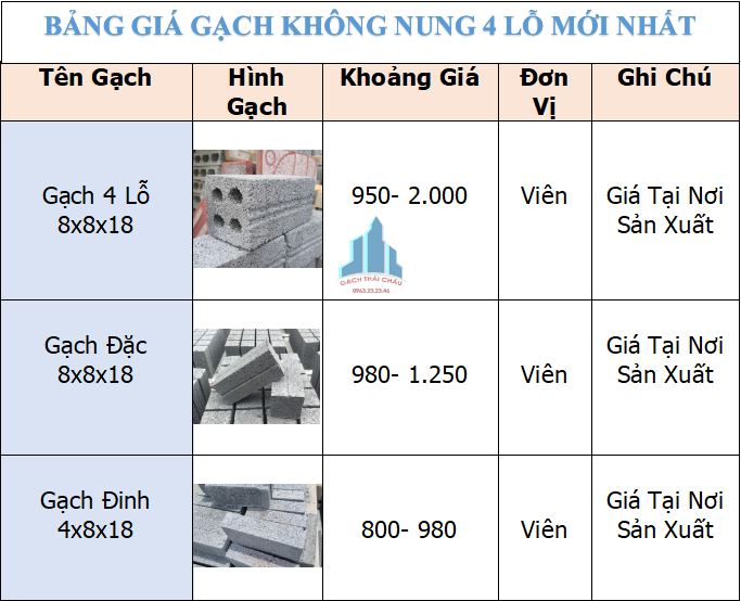 Lưu ý: báo giá trên chỉ mang tính chất tham khảo khi lấy gạch tại nhà máy sản xuất. Thực tế, giá gạch block 4 lỗ còn phụ thuộc vào mac gạch, số lượng và vị trí công trình. Để nắm được rõ hơn giá gạch block 4 lỗ giao tới tận công trình của mình, xin quý khách hàng vui lòng liên hệ tại góc cuối của màn hình trang web hoặc gọi số điện thoại: 0963.23.23.46 nhân viên tư vấn của Gạch Thái Châu sẽ tư vấn thật kỹ về các loại gạch và tính toán chi tiết giá gạch block 4 lỗ giao về công trình của bạn.