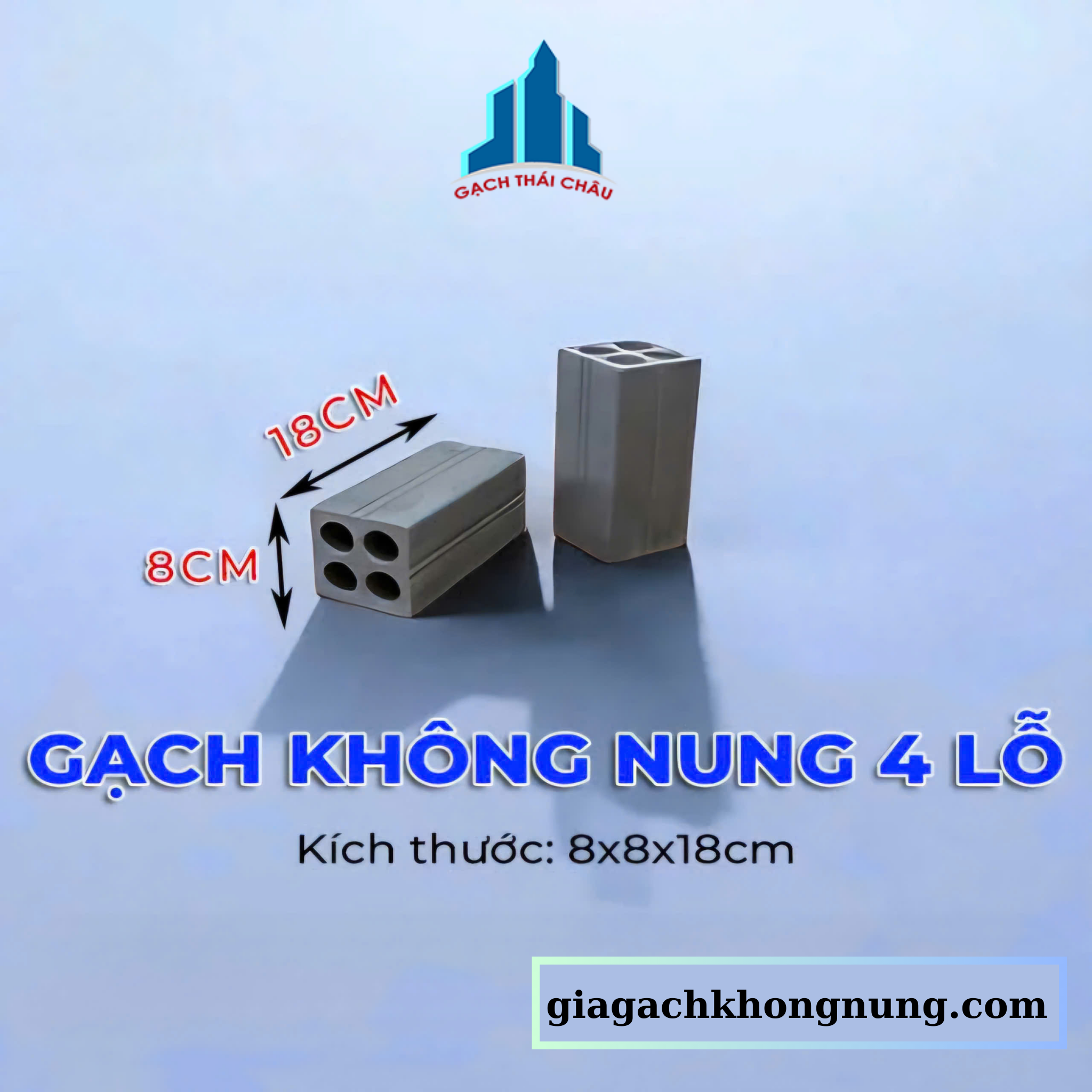Gạch block 4 lỗ có kích thước chi tiết: Dài 18cm, Cao 8cm, Rộng 8cm, Vách ngăn dày 2 cm. Gạch block 4 lỗ được dùng để thay thế gạch tuynel truyền thống, gạch holmen do có kích thước hoàn toàn giống như nhau. Trọng lượng khô của viên gạch là 1.8kg/viên, kích thước và trọng lượng này giúp vận chuyển và cầm viên gạch để xây và chỉnh sửa rất phù hợp với khả năng của các đội ngũ thợ xây do cũng không nặng quá. Việc cầm tay viên gạch để xây và chỉnh sửa cho đẹp rất đơn giản và nhanh chóng.