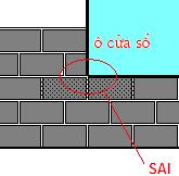 - Kỹ thuật xây: Thợ xây đặt vị trí viên gạch tại vị trí góc dưới cửa sổ chưa đúng kỹ thuật như hình dưới cũng là 1 nguyên nhân (mạch vữa trùng cạnh cửa):