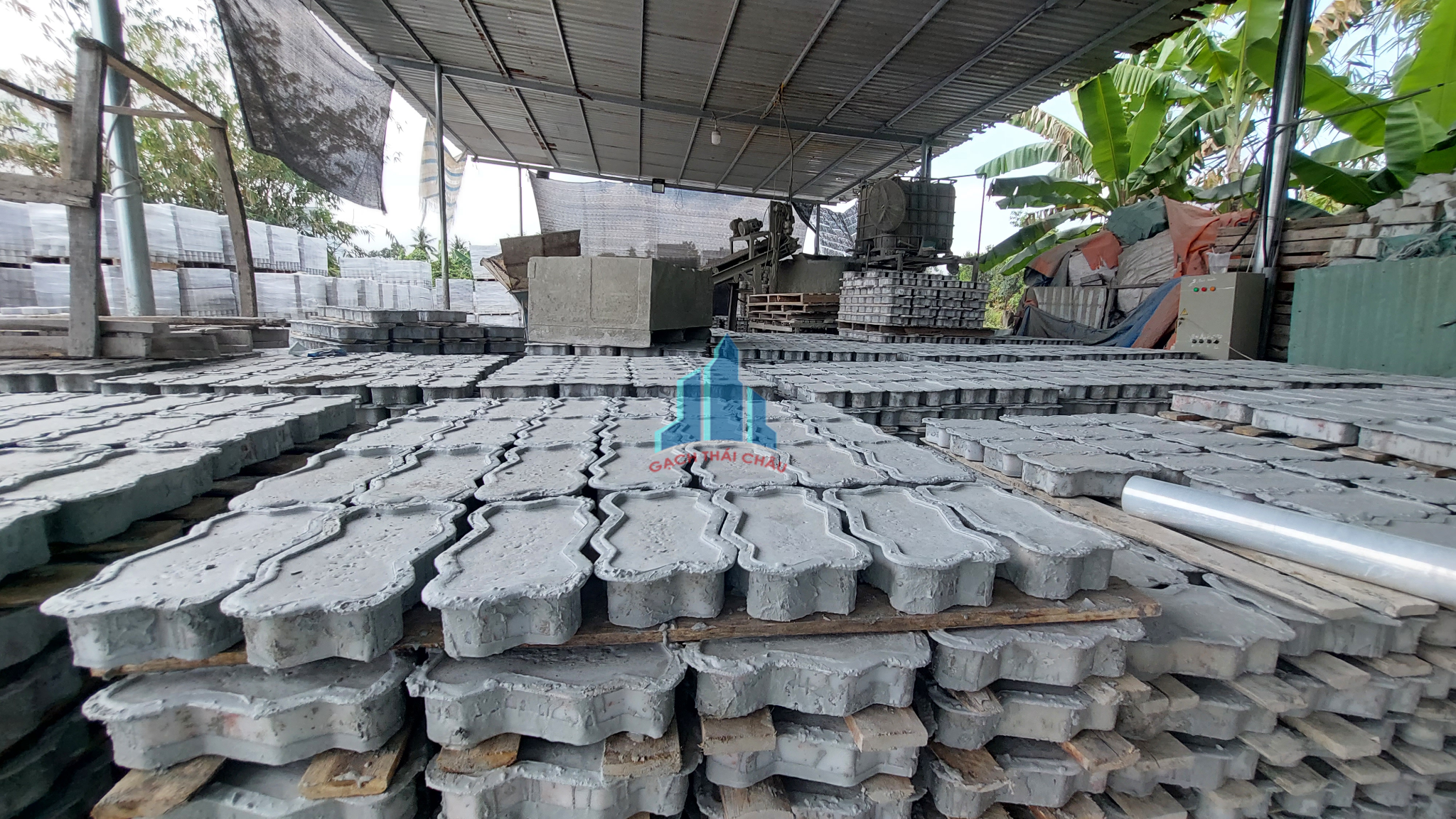 Sau đó, khuôn gạch sẽ được xếp lên pallet để đưa ra bãi dưỡng chờ đông cứng trong khoảng 48 giờ. Tiếp theo, các khuôn gạch tự chèn đạt đủ độ cứng sẽ được đưa ra hệ thống máy rung để tách gạch ra khỏi khuôn một cách nhanh chóng và dễ dàng. Phần gạch sau khi được tách ra khỏi khuôn sẽ được xếp gọn lên pallet, đóng kiện và quấn màng để giao tới công trình cho khách.
