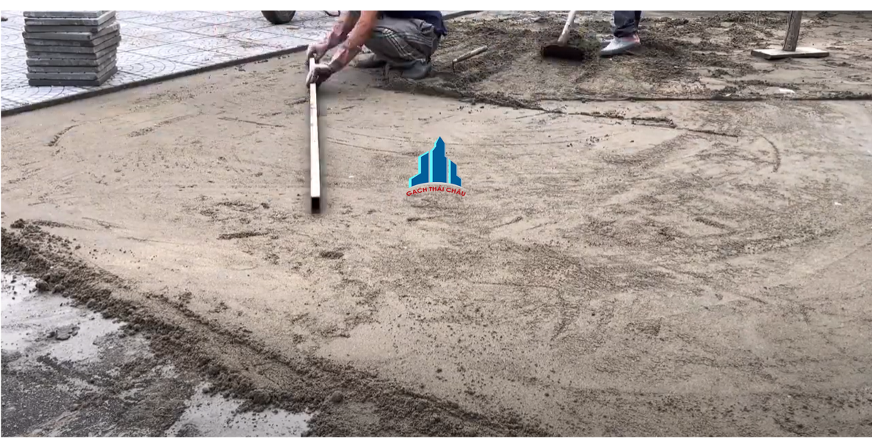 Sau khi chuẩn bị lớp nền thật bằng phẳng và không có vật cản gì, bạn sẽ tiến hành tạo lớp nền bằng cát. Bạn rải một lớp cát mỏng có chiều dày từ 3-5cm, cần sử dụng các dụng cụ thi công cần thiết như là: thước, bàn xoa,… để tiến hành san phẳng đều nhằm đảm bảo độ chịu lực tốt và tính thẩm mỹ cao. Đối với các công trình có diện tích lớn nên sử dụng máy đầm nền để tiết kiệm thời gian, nhân công, chi phí và có hiệu quả cao hơn. Chú ý, dùng máy đầm hoặc bay cán nền thật kỹ, đảm bảo không bị lún hay lẫn sỏi đá làm ảnh hưởng đến chất lượng nền sau khi hoàn thiện. Căn chỉnh cao độ, độ dốc đi về hướng hố ga hay đường thoát nước.