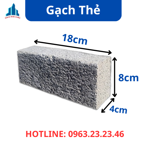 Gạch block thẻ có kích thước chi tiết: Dài 18cm, Cao 4cm, Rộng 8cm. Gạch block thẻ 4x8x18 dùng thay thế cho gạch tuynel thẻ truyền thống do có kích thước tương tự nhau. Với ưu điểm vượt trội là cường độ và độ bền cao hơn rất nhiều. Gạch được phơi khô bảo dưỡng sau 14 ngày có thể đạt cường độ Mac 75-200. 1m2 tường thường chỉ sử dụng khoảng 83 viên gạch block 4x8x18 và hết khoảng 0,06 m3 vữa. Và nhờ có chiều cao chỉ 4cm và trọng lượng là 1.1kg nên gạch còn được sử dụng để decor, trang trí tường rất nhiều.