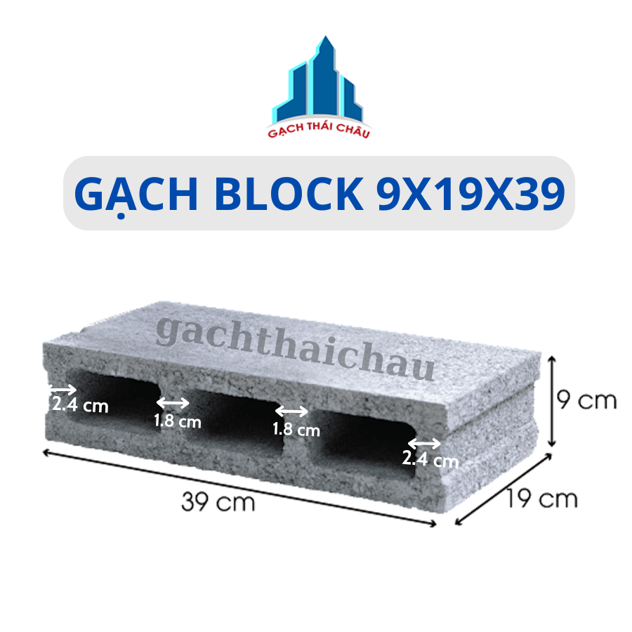 Gạch block 9x19x39 có kích thước chuẩn: Dài 39cm, Cao 19cm, Rộng 9cm. Hình dạng của gạch block 9x19x39 thì một mặt có 3 lỗ rỗng trên bề mặt, một mặt được bịt kín. Lỗ rỗng trên bề mặt gạch block 9x19x39 tương đối lớn, có chiều dài là 10cm, chiều rộng là 5cm. Các lỗ rỗng này có tác dụng làm giảm trọng lượng gạch, cách nhiệt, cách âm hiệu quả hơn so với các loại gạch đặc. Nhiều người lo ngại rằng lỗ rỗng lớn như vậy sẽ ảnh hưởng đến độ cứng, độ bền của gạch nhưng thật ra giữa các lỗ rỗng có 2 vách ngăn giữa với chiều dày vách ngăn giữa các lỗ rỗng khoảng 2cm. Ngoài ra, thành bao xung quanh của viên gạch block 9x19x39 có chiều dày là 2.4cm, giúp đảm bảo độ cứng và khả năng chịu lực của gạch rất tốt.