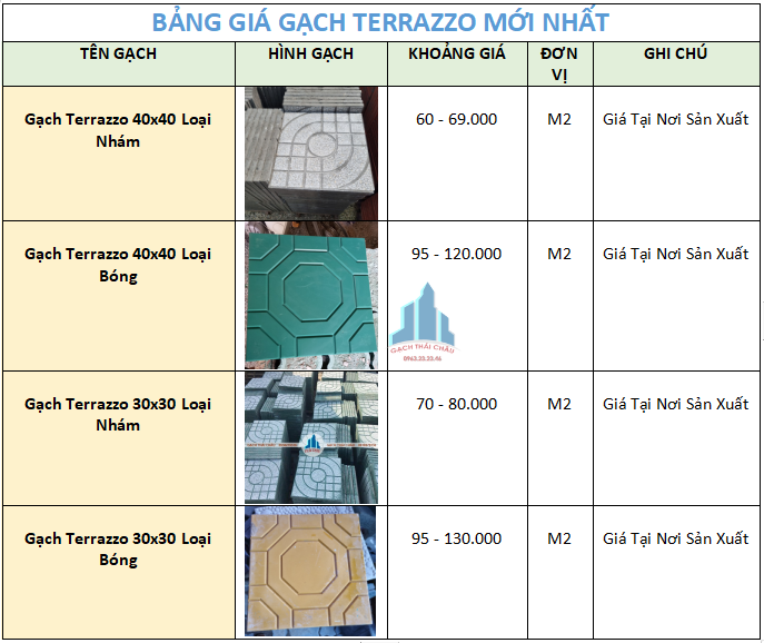 => Trên đây là bảng gạch terrazzo được cập nhật tại nhà máy sản xuất Gạch Thái Châu. Giá gạch trên áp dụng cho khách đến lấy tại xưởng, để giao hàng tới tận các công trình thì thường phải cộng thêm chi phí vận tải khoảng biên độ từ 10 đến 20% tuỳ theo số lượng và vị trí giao hàng.
